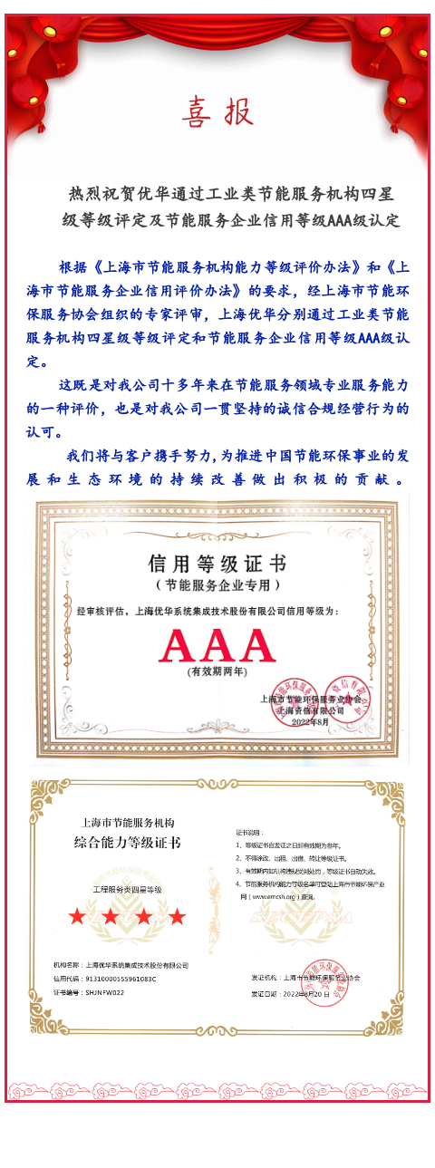 熱烈祝賀優華通過工業類節能服務機構四星級等級評定及節能服務企業信用等級AAA級認定